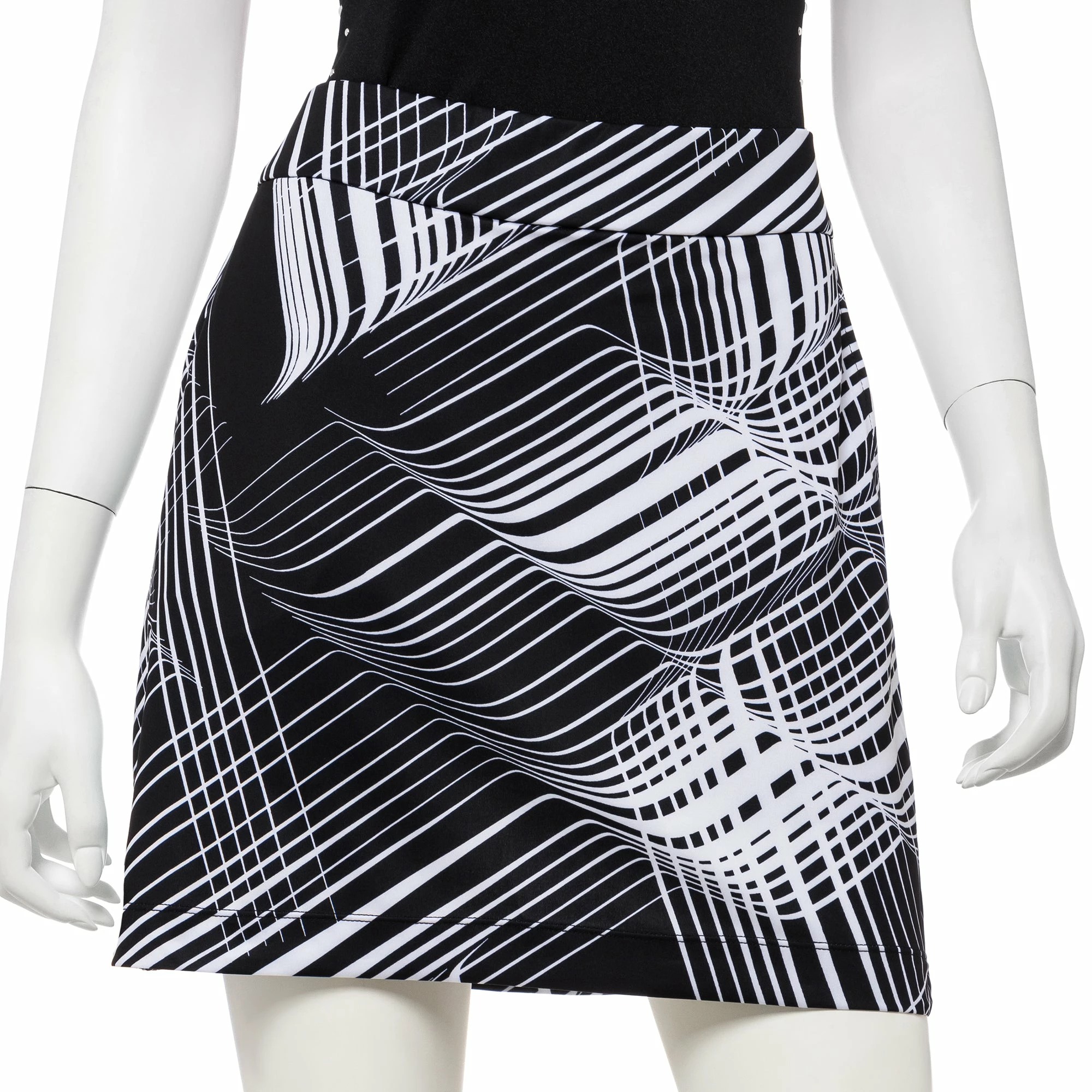 The EP NY Work It Spirograph Print Womens Golf Skort will make a bold statement on the course. This pull-on skort is featured in an attention grabbing spirograph print with filament tape trim side accents, front angled pockets, one back pocket, and built-in tricot undershorts.