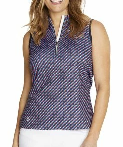The GGBlue Sophia Sleeveless Womens Golf Polo is offered in an all-over diagonal print in Navy/Orange/White, and a dual fabric, solid front polo with a Jade/Black/Gold feline print on the shoulders and back. Both have a mock neck with a zip placket.