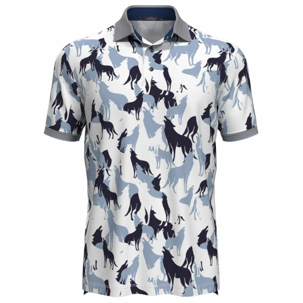 Designed to match the true strength of the wolf and its pack comes the Greyson In The Shadows Golf Polo. This polo has a stylish and unique all-over print that features a sophisticated wolf pattern. The Shadows is built with a super comfortable eight-way stretch that is moisture wicking and antimicrobial to keep you dry, comfortable and smelling fresh throughout the round. The contrasting collar and all-over print will make the Shadows a stylish addition to your wardrobe.