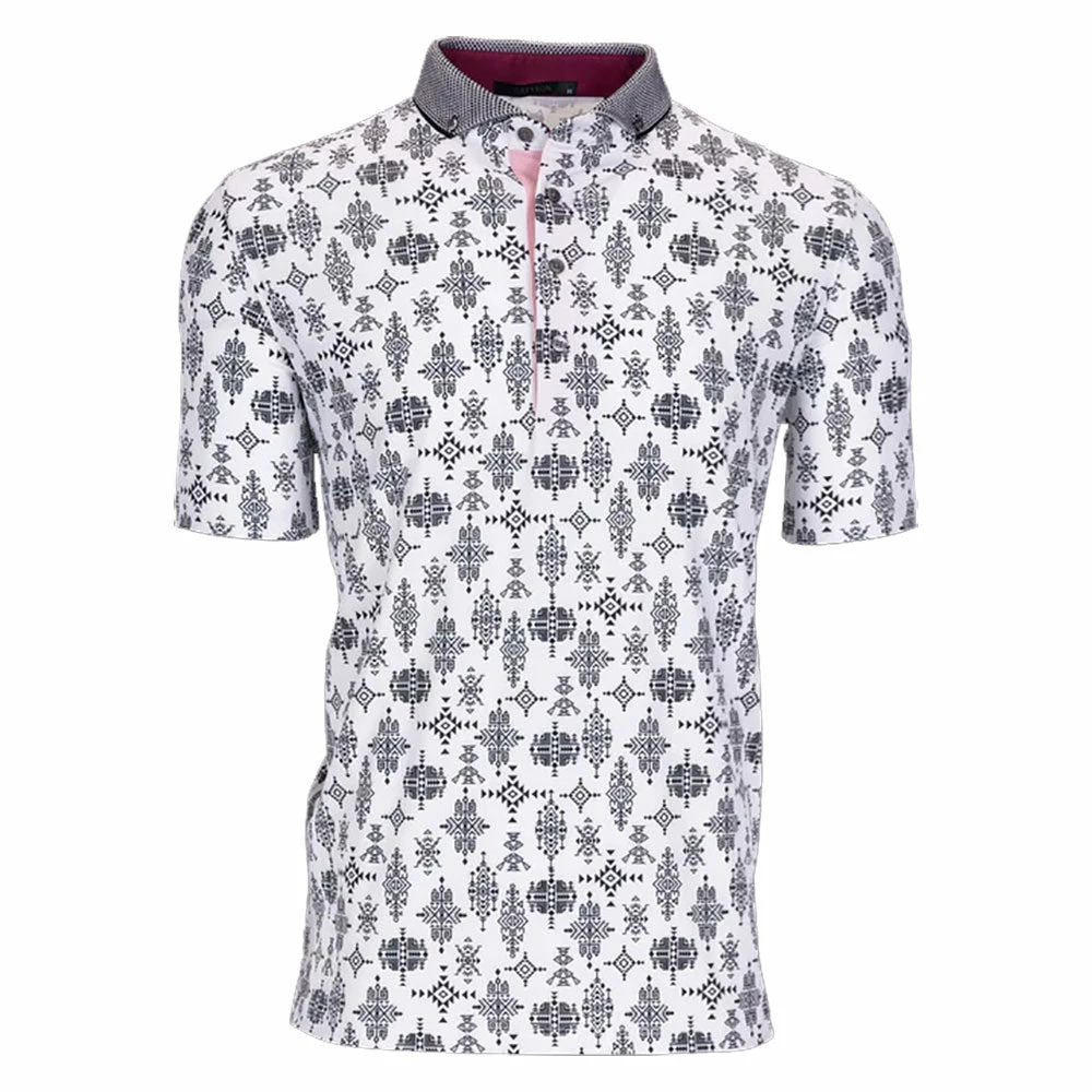Inspired by the folklore of New Mexico comes the Greyson Spirit World Mens Golf Polo. Made from a polyester/spandex blend, this lightweight, antimicrobial, and moisture-wicking polo will provide superior comfort and freedom of movement on and off the golf course. It features a four button placket, jacquard button-down collar, and a striking pattern throughout.